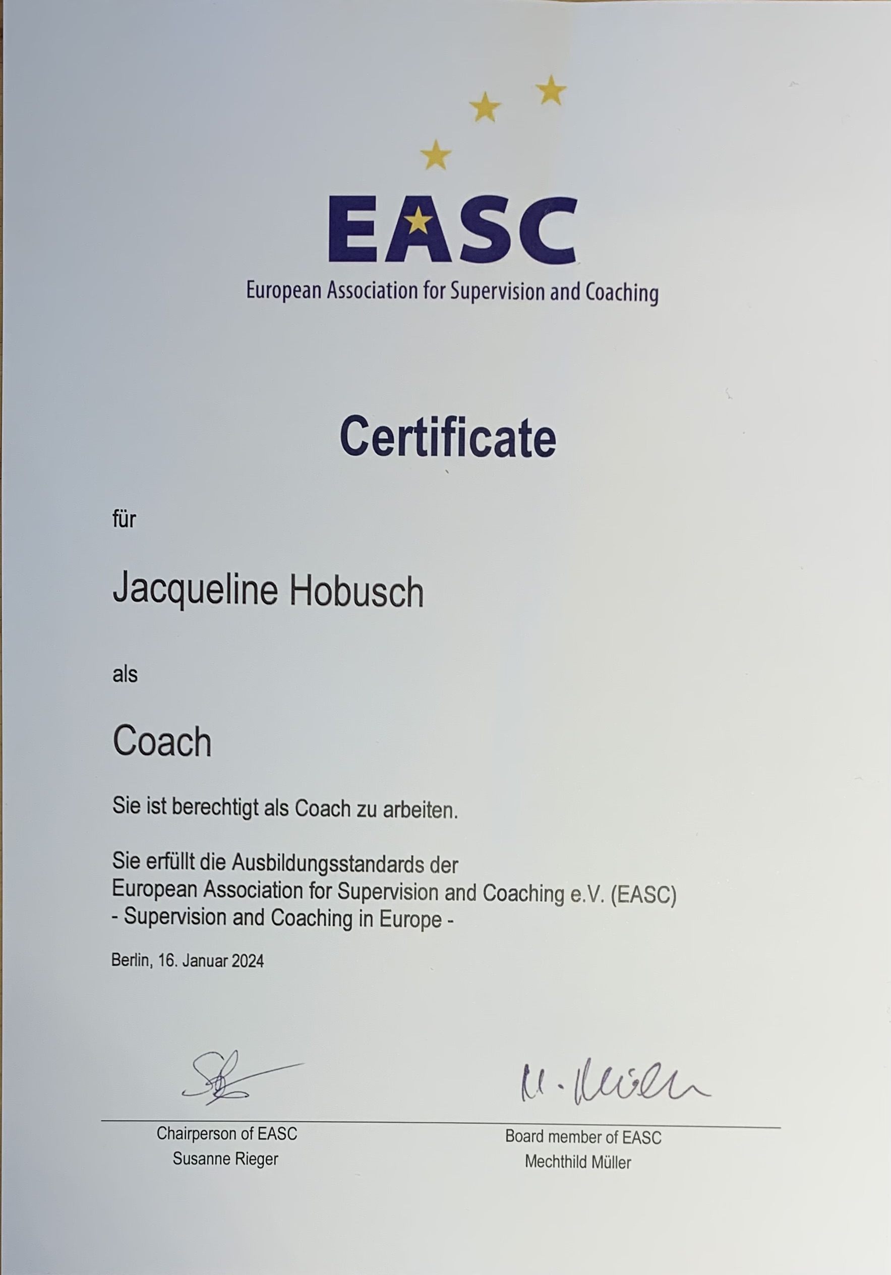 Ausbildung bei Verena König – traumasensibles Coaching, Arbeit mit inneren Anteilen & Nervensystemregulation - seit 2024 erfülle ich die Ausbildungsstandards der EASC.